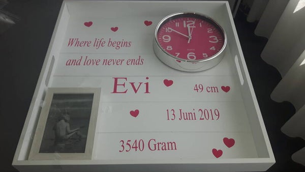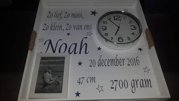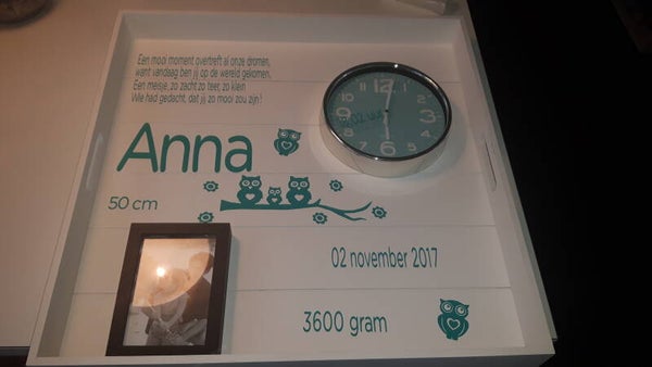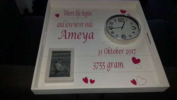 De dienbladen zoals op foto zijn uitverkocht wij leveren alles nu op een witte houten bord van 50x50 zonder opstaande rand.