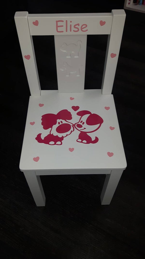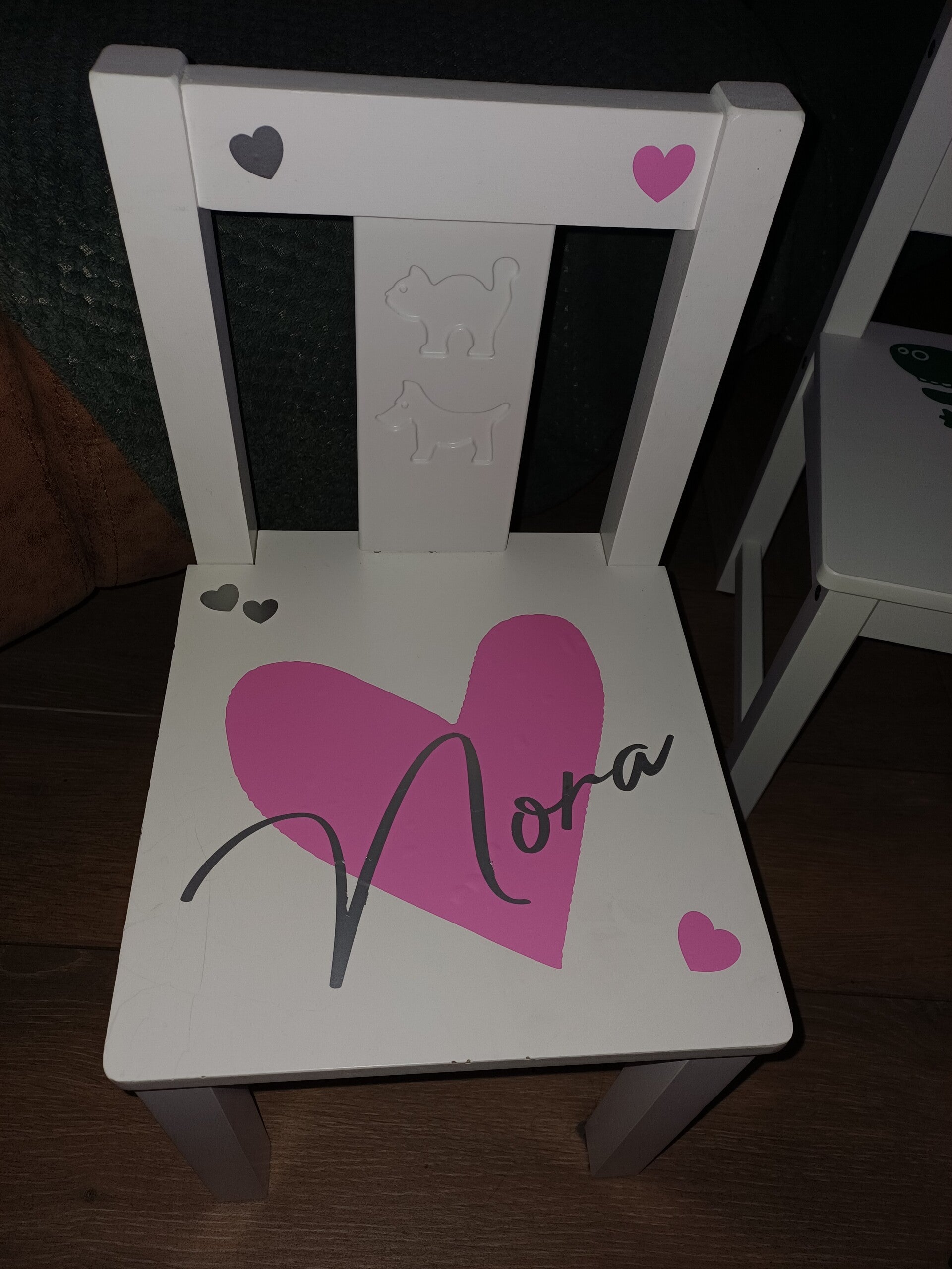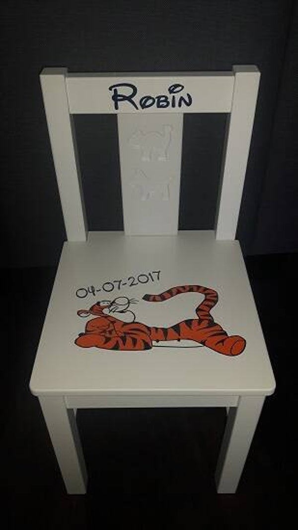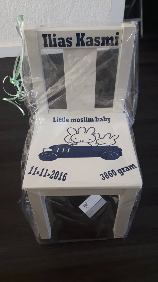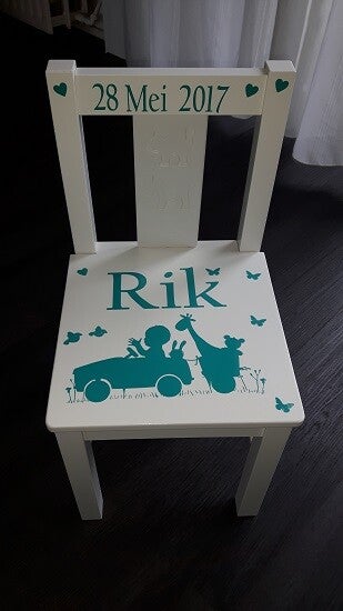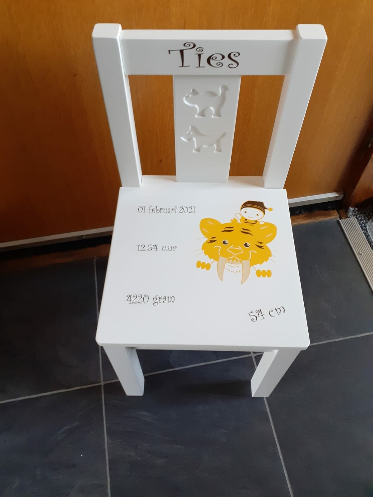 Stoel wordt geleverd( door ons geplakt op vinyl) incl. naam, geboortedatum en afbeelding naar keuze.