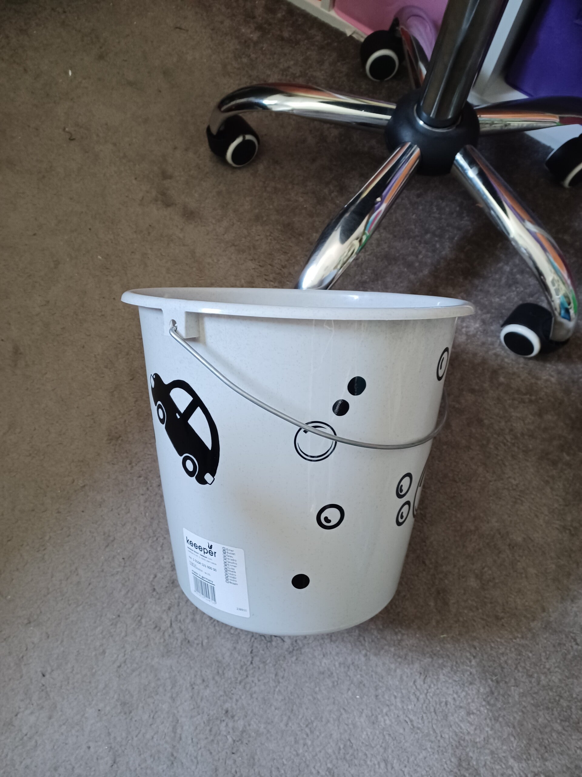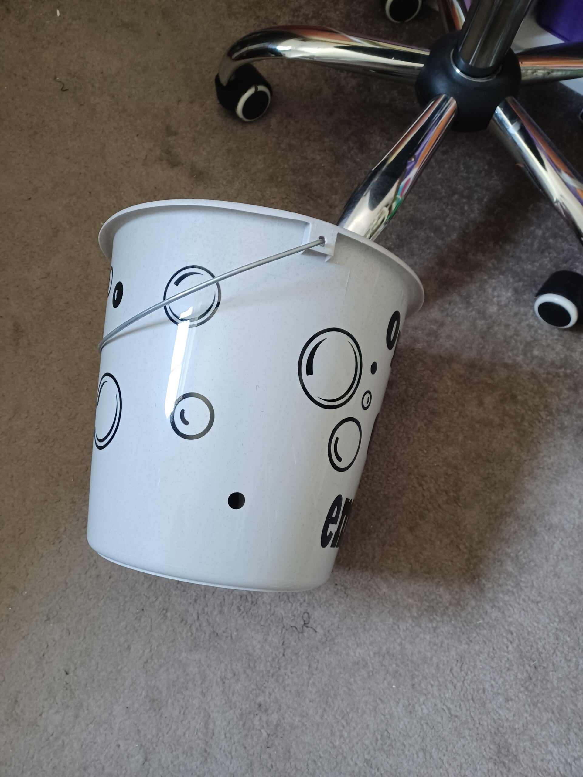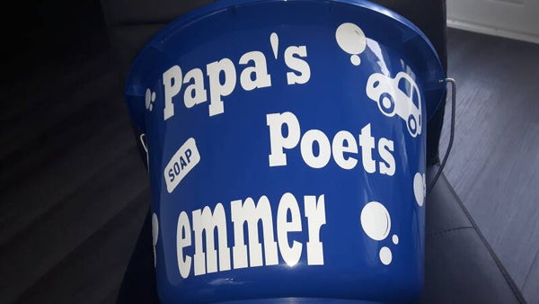 Blauwe emmer met de tekst eerste hulp bij auto poetsen.