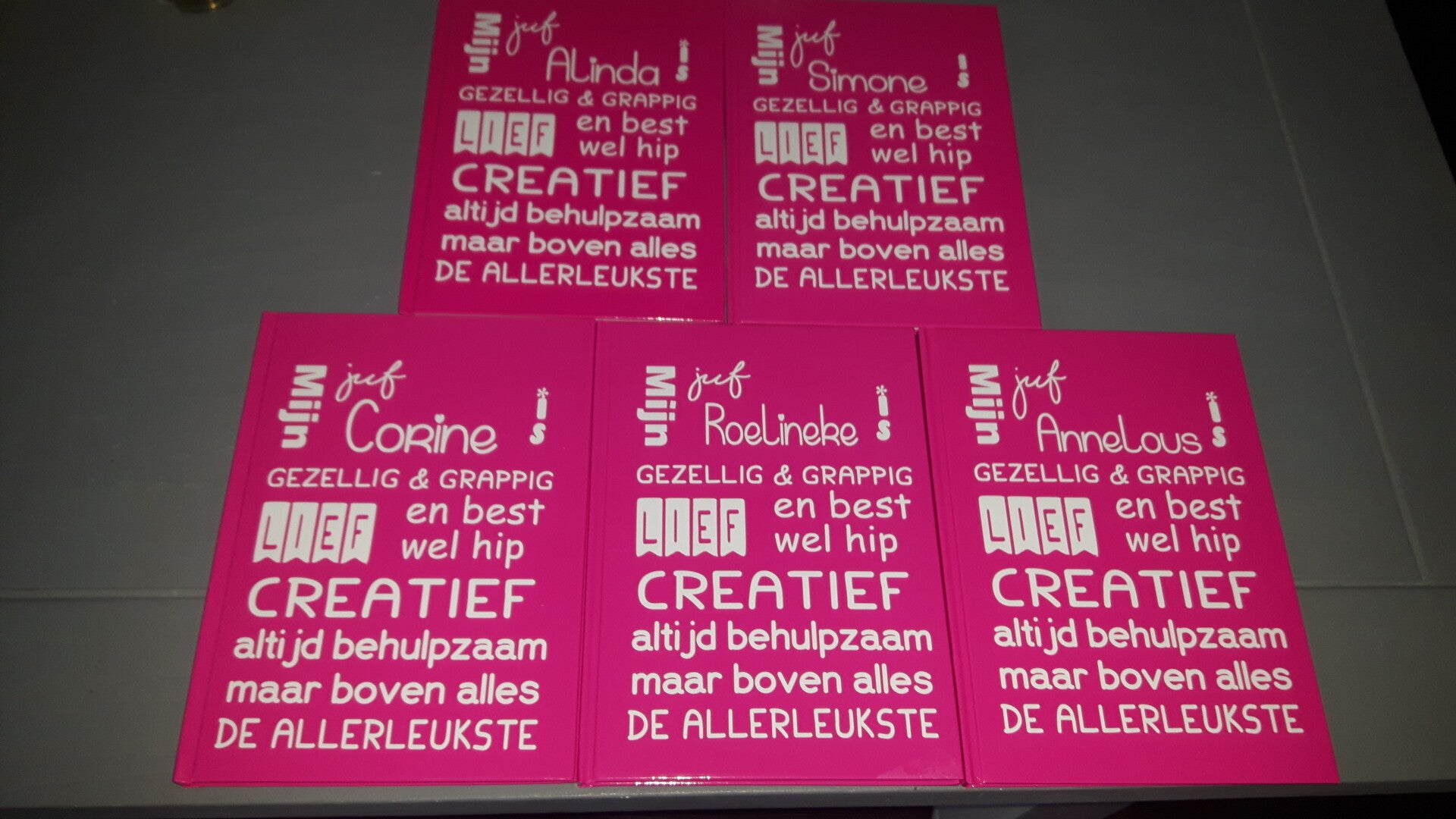 Wilt u deze ontvangen hoeft u alleen de naam van de juf in te vullen, ook leverbaar voor de meester vermeld dan erbij meester dan wordt het boekjes in blauw of mintgroen geleverd.