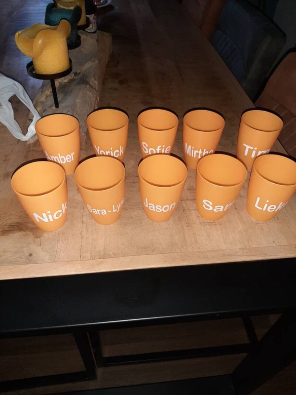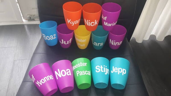 Vermeld aan het eind van uw bestelling bij opmerkingen de naam en evt welke naam op welke kleur beker. Indien gewenst ook lettertype