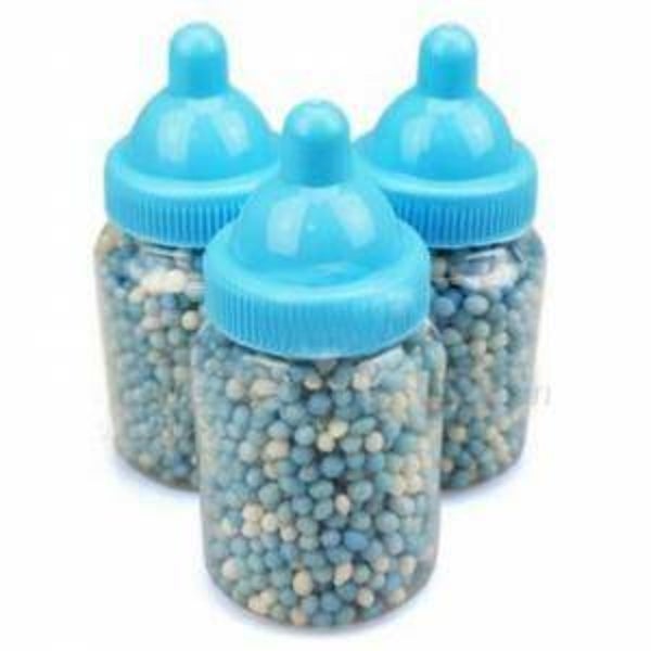 Flesje is blauw met houten beer of houten kinderwagen eraan