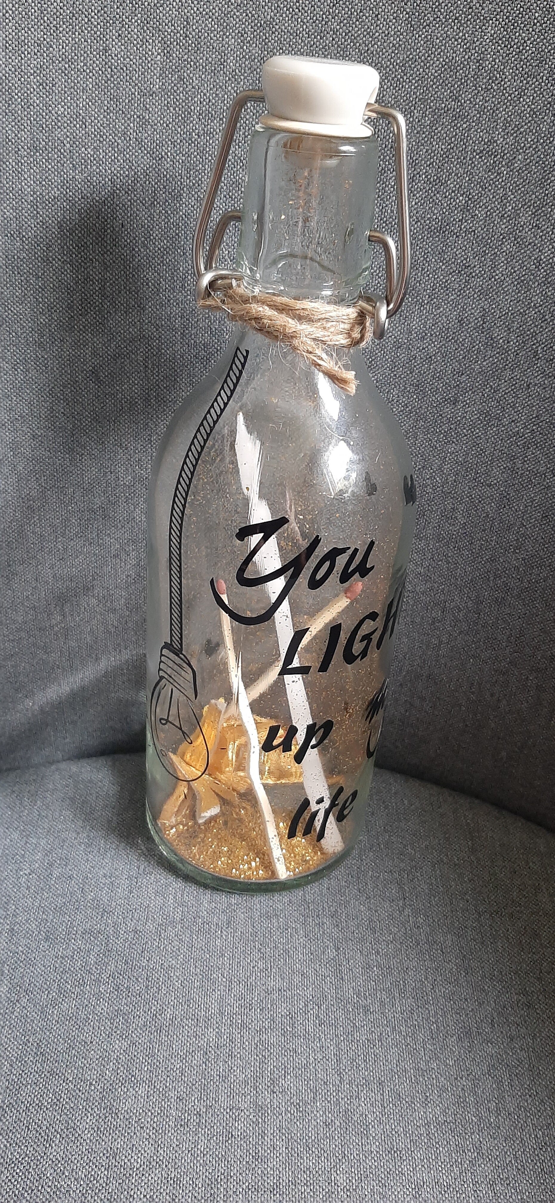 Fles met tekst you light up my life en afbeelding met lamp aan touw.
