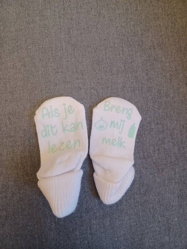Leuke witte baby sokjes met fel gele tekst.