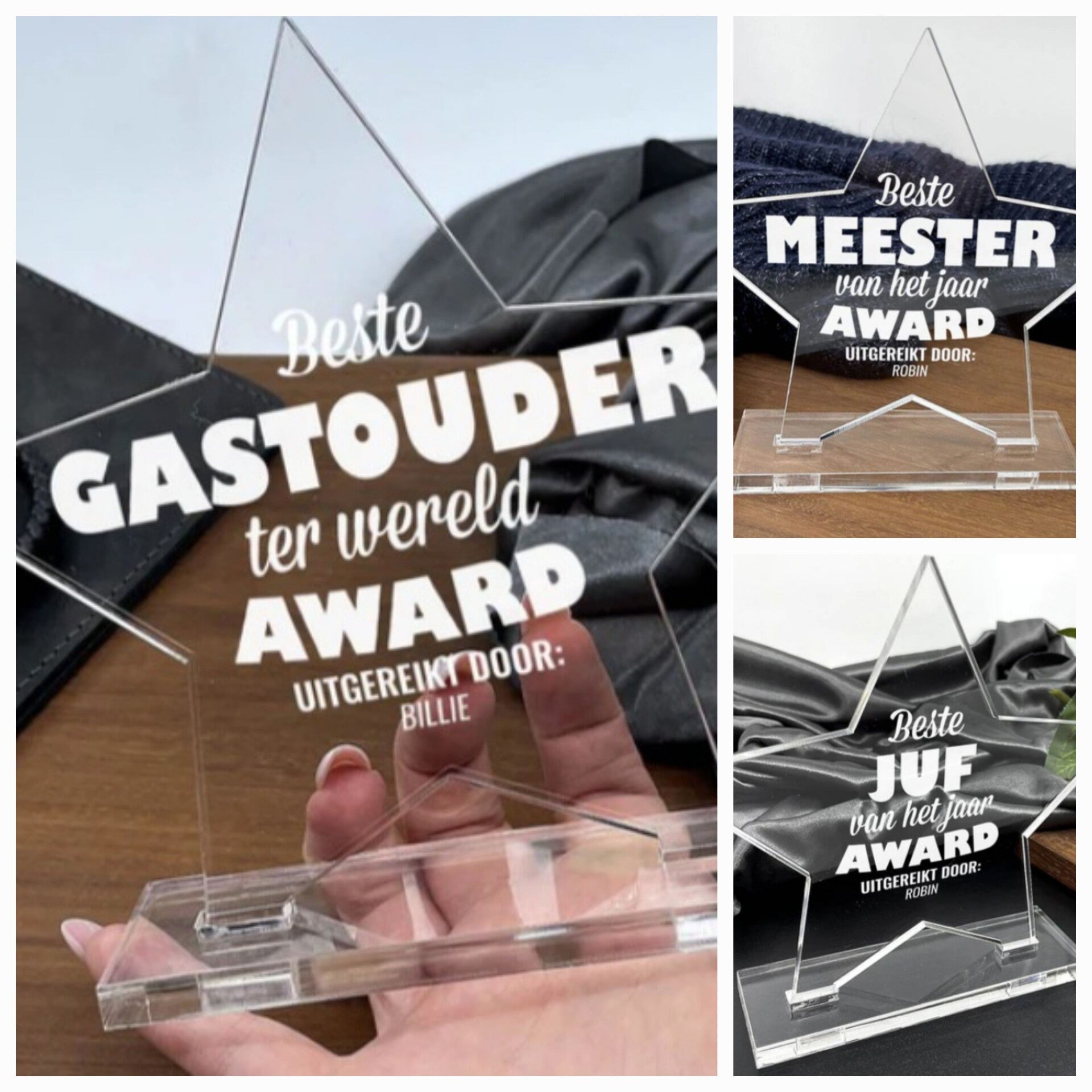 Ook leuk als award weg te geven( zie voorbeelden tekst van de foto) wilt u zo'n tekst vermeld dan award juf , award meester of gastouder. Eigen tekst ook mogelijk!